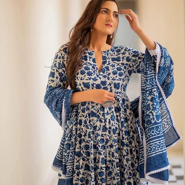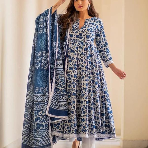 MEERA FAB Women's Cotton Printed Anarkali Kurta with Palazzo & Dupatta Set