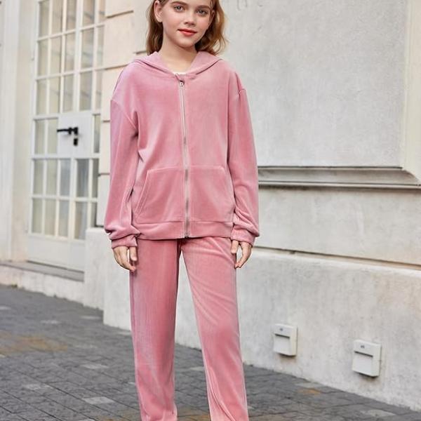 TIPS: Girls velour tracksuit fit are regular , not slim. For wearing effect, please refer to the details of the model's height and weight. If you like loose fit, we recommended buying a large size.