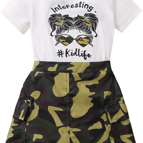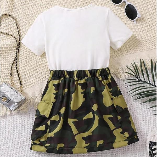 Features: 2 piece outfits for girls, with letter graphic print tee and camo print aline skirt set
