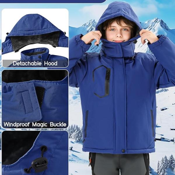 Kids Winter Jackets Warm Fleece Waterproof Snow Jacket with Zipper Pockets Detachable Hood