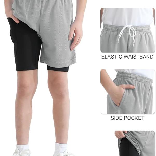 【2 in 1 Design】kids' performance shorts feature a double-layer design. The outer layer is lightweight, loose and quick-drying, with an elastic adjustable waistband. The inner layer is soft, slim, and breathable, with a built-in super-elastic compression support structure that keeps you cool and flexible during exercise.