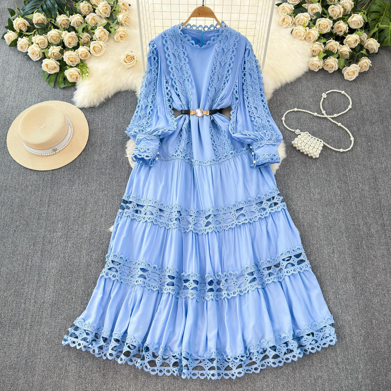 Palace Style Dress Summer Dress For Women Heavy Hollow Lace Stitching Slim Fit Long French Puff Sleeve High-end Dress
