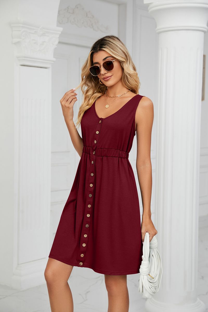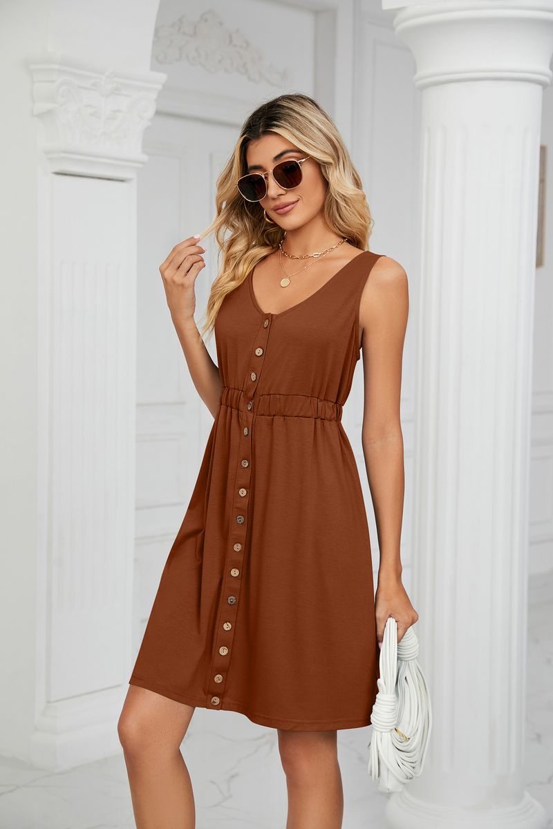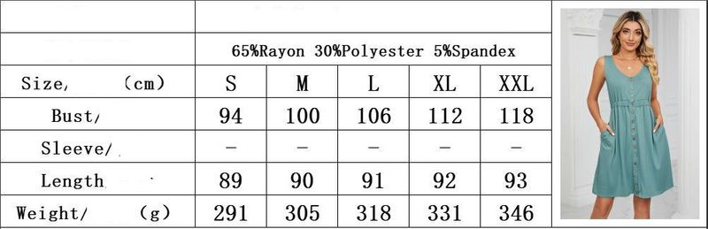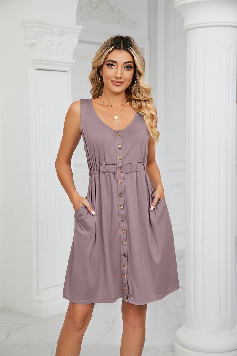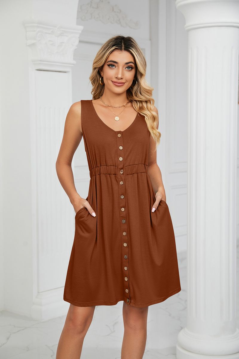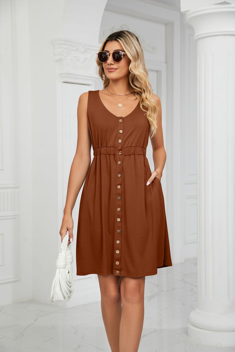 Women's Clothing Casual Solid Sleeveless Button Pocket Round Neck Split Waist Dress