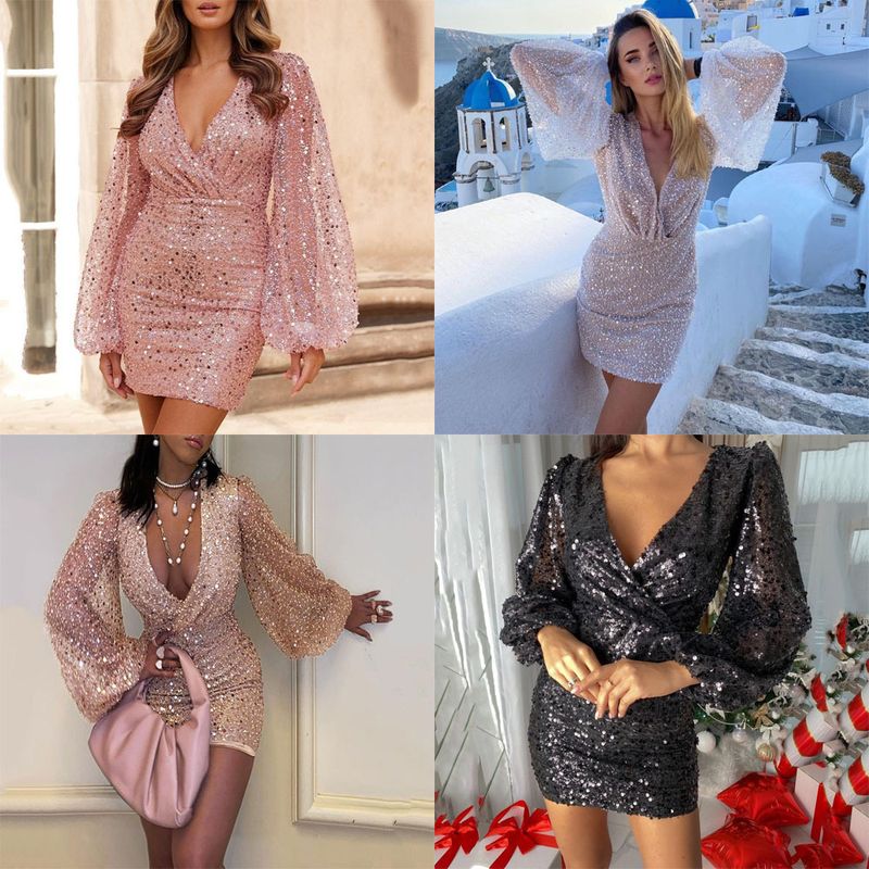 Women's Clothing new women's clothing dress long sleeve V neck sequin waist hip skirt