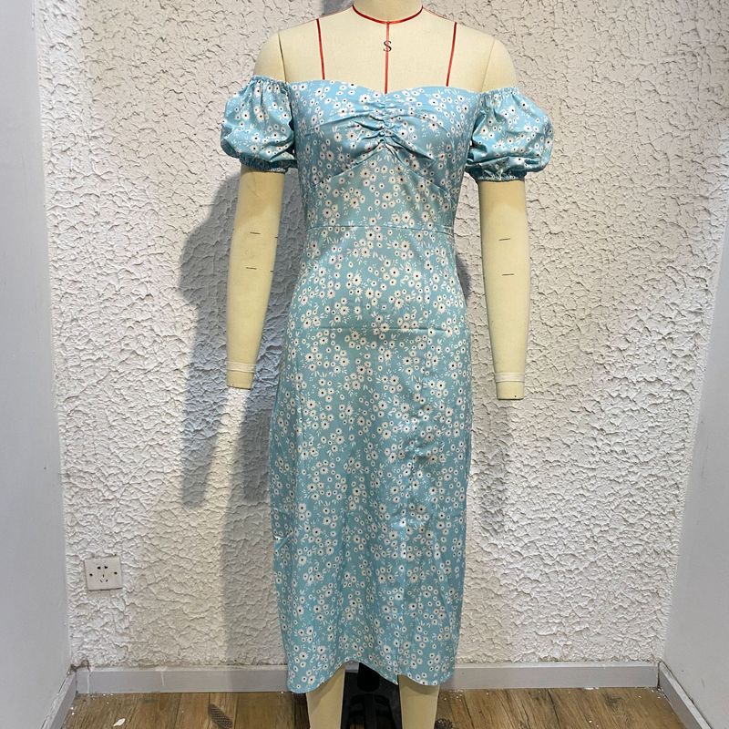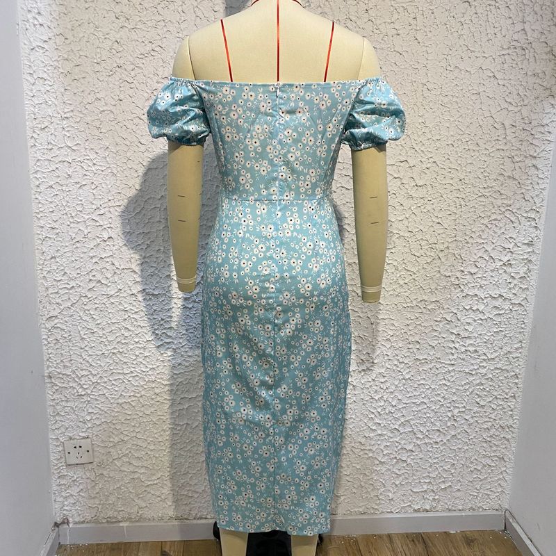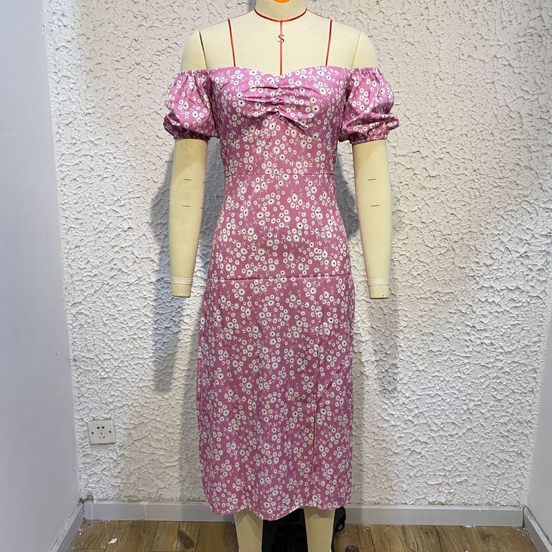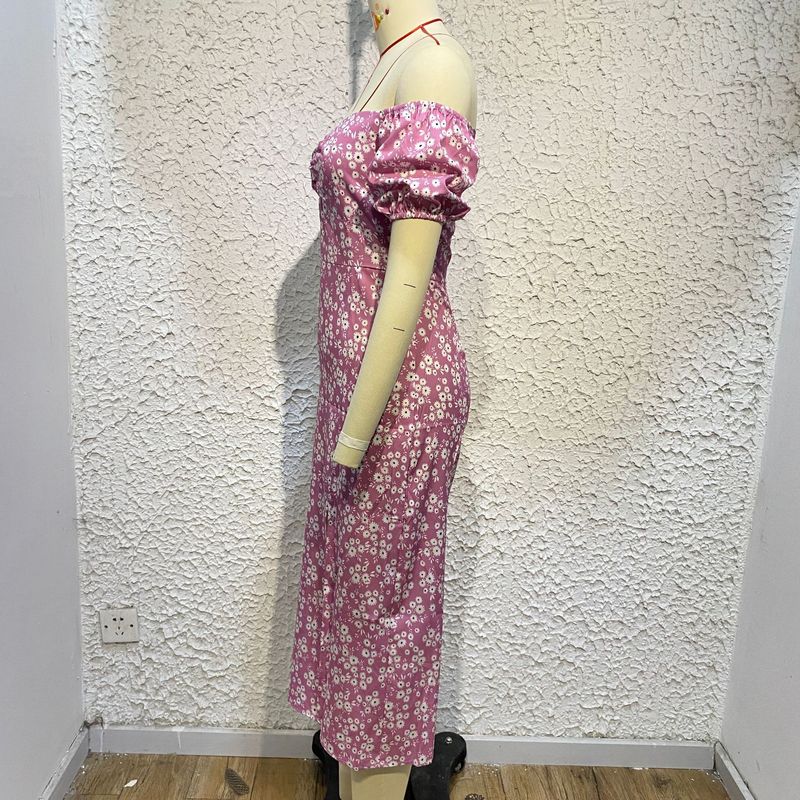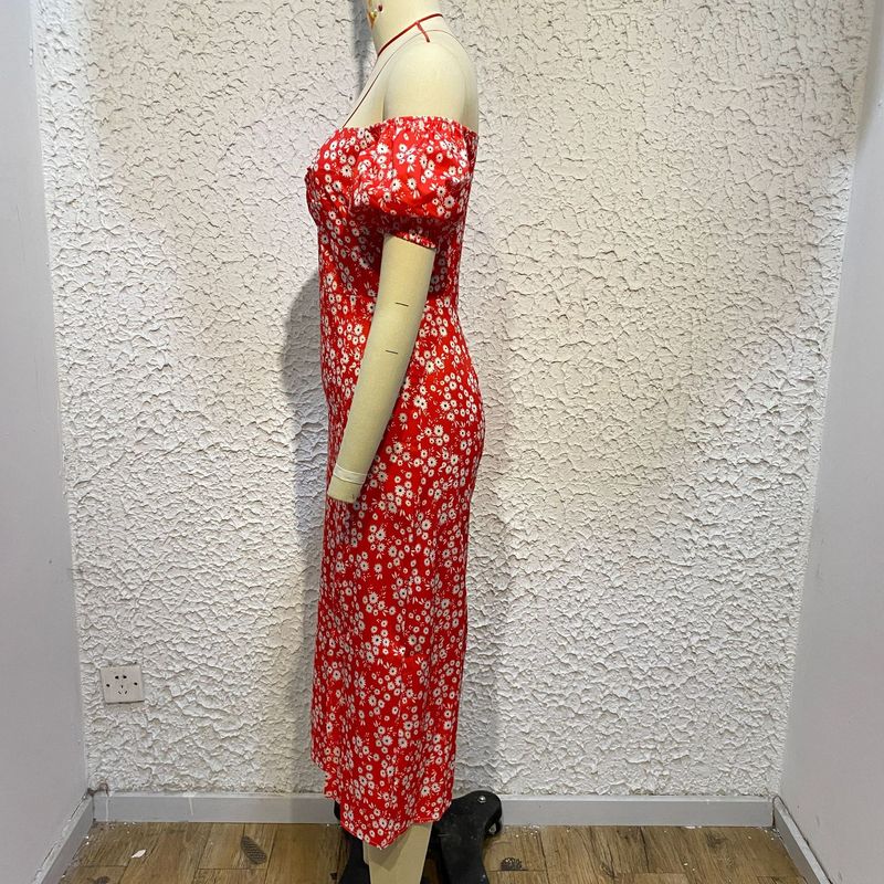 Women's Hip Wrap Split One Line Neck Dress Classic Fragmented Flower Style Spring Dress