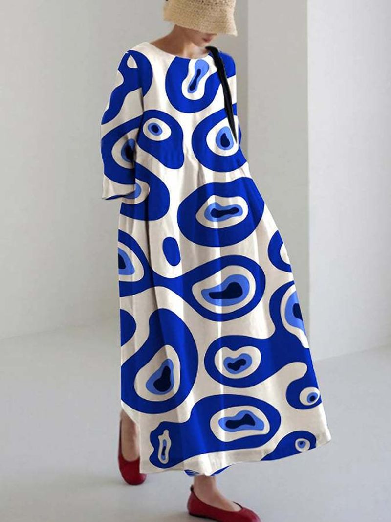 Women's loose round neck fashionable high-end long-sleeved printed dress